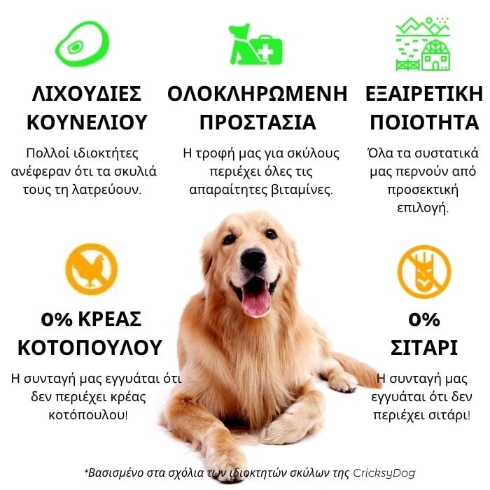 Αυτό σημαίνει ότι οι ποιοτικές ξηρές τροφές CricksyDog προσφέρουν τη σιγουριά ότι μπορείς να παρέχεις στον σκύλο σου την κατάλληλη και ισορροπημένη διατροφή σε κάθε κατάσταση — με εξαιρετική σχέση ποιότητας-τιμής. Αυτό είναι το πραγματικό πλεονέκτημα της ξηρής τροφής CricksyDog!