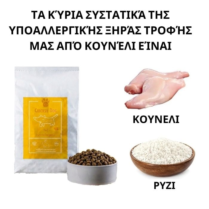 «Αυτή η τροφή είναι υποαλλεργική και περιέχει κουνέλι ως κύρια ζωική πρωτεΐνη. Η συνταγή της δεν περιέχει κοτόπουλο και γλουτένη σιταριού, καθιστώντας την κατάλληλη για ευαίσθητους σκύλους που έχουν τροφικές αλλεργίες.